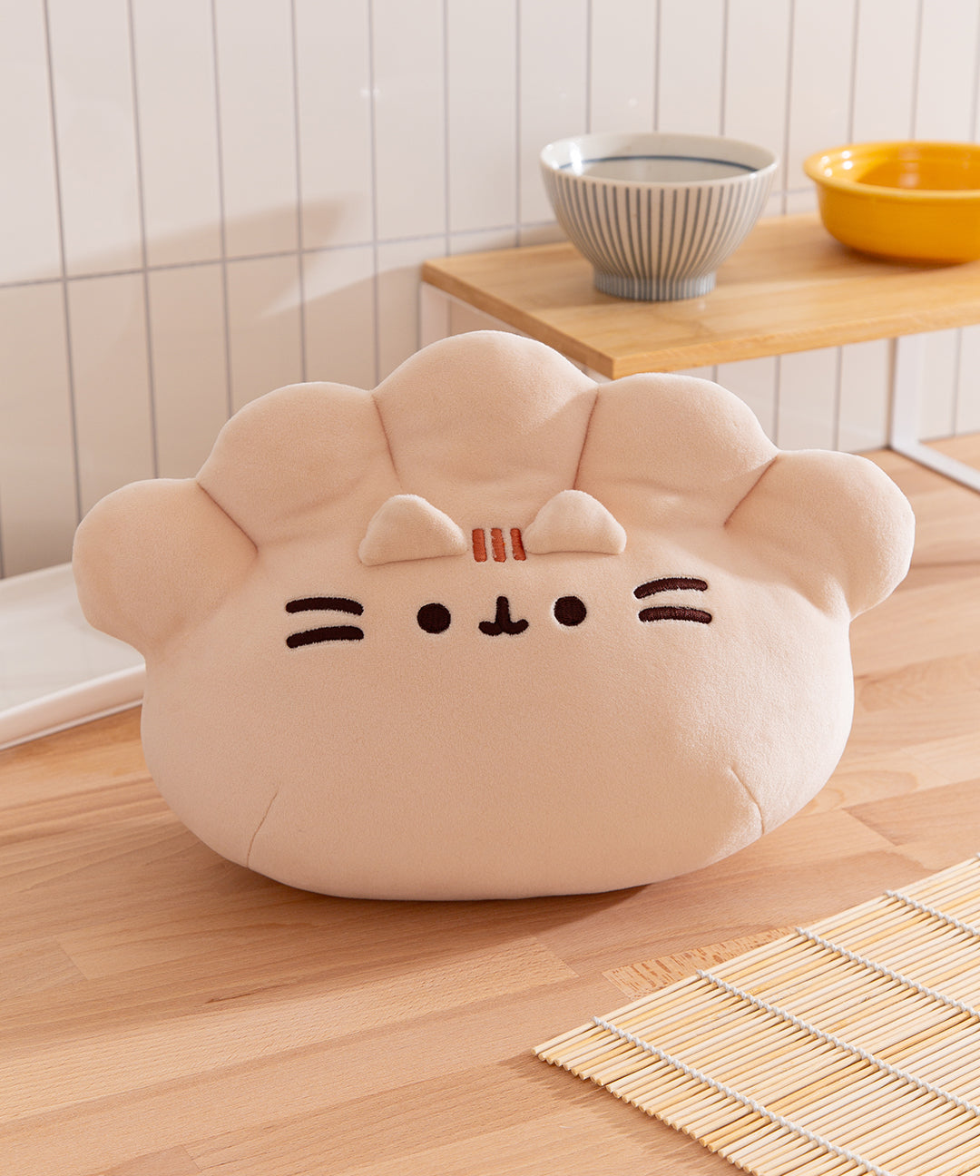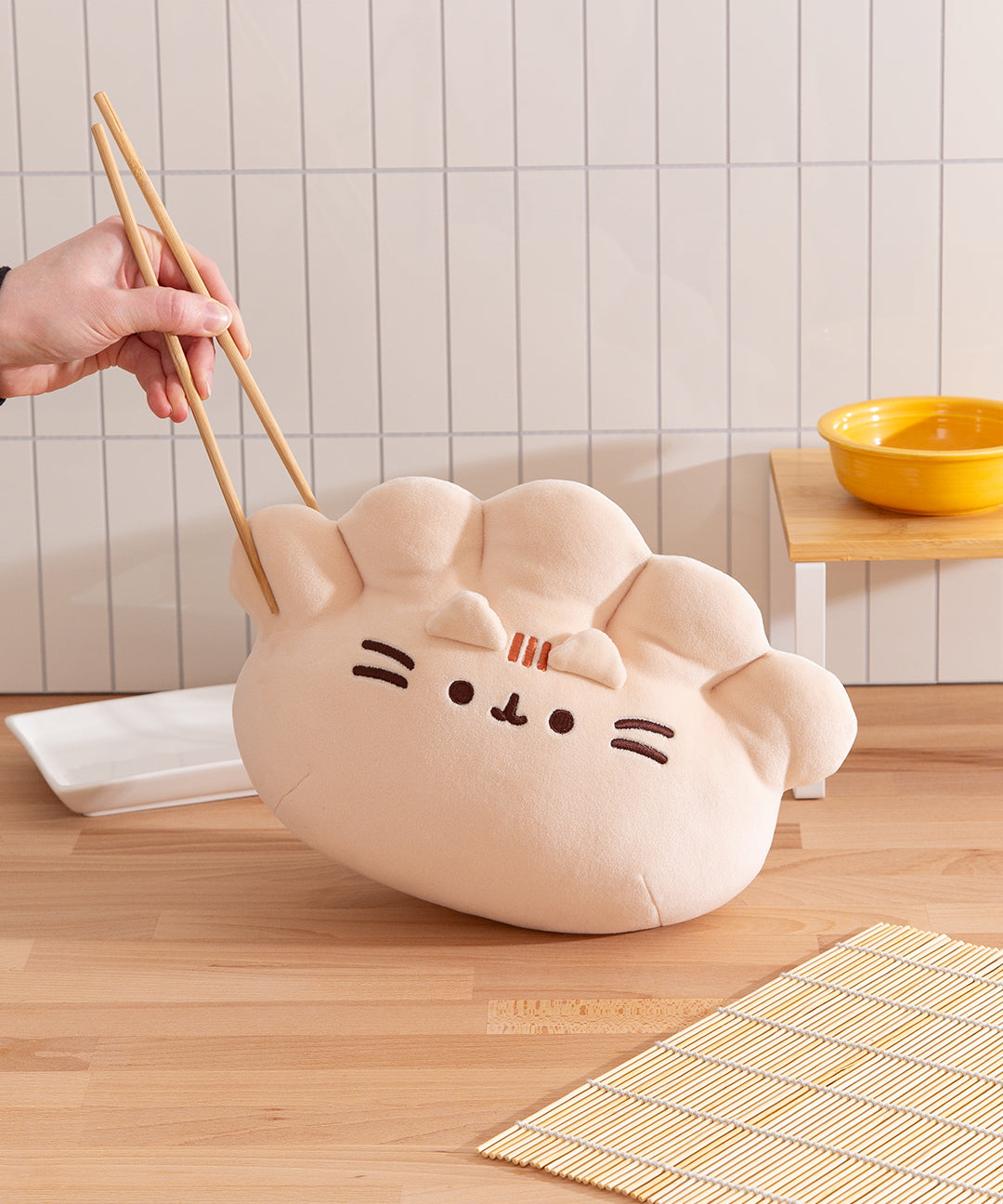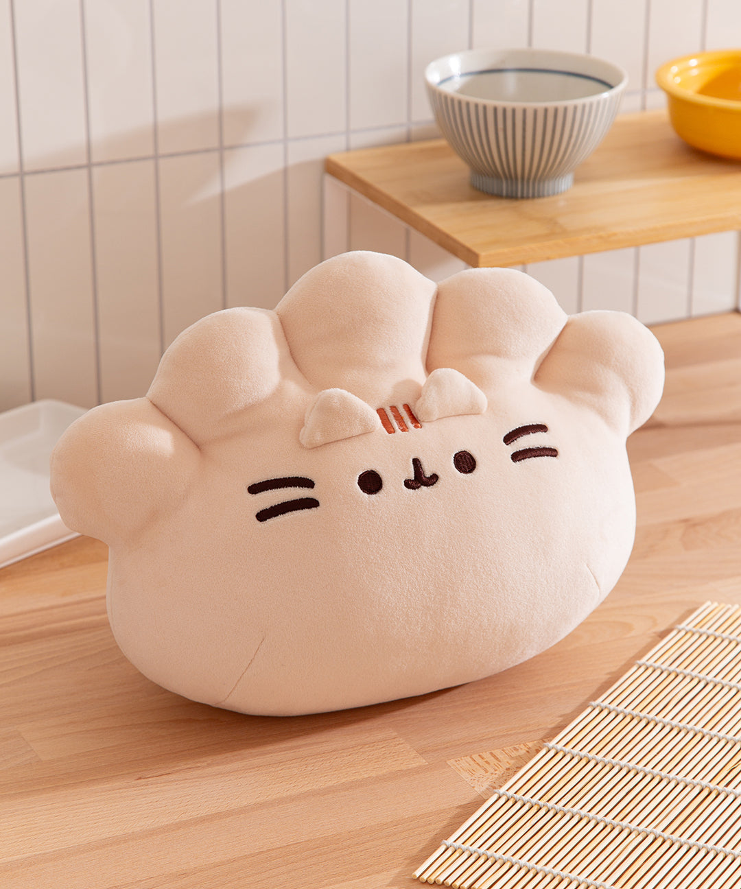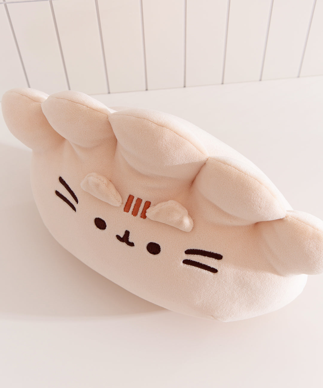 Indulge in a tasty snack as Pusheen transforms into one of her favorite Asian delicacies! This extra-large 11” Gyoza Squisheen Plush shows Pusheen as a squishy, delightfully plump dumpling. Pusheen’s adorable face is adorned with deep brown embroidery and embroidered creases at the top. Give her a hug – this Squisheen is made from premium soft plush materials that are extra squishy and oh-so-satisfying to squeeze! Its fun, huggable design make this whimsical piece a must-have for any foodie’s collection. Squisheens are super-soft & squishy, and surface washable for easy cleaning.
