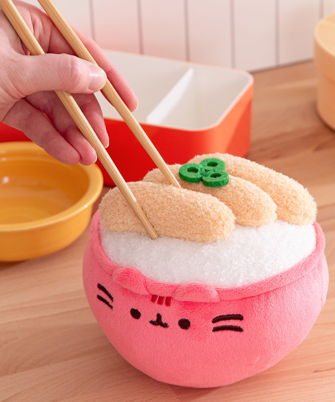 Indulge in a tasty snack as Pusheen transforms into one of her favorite Asian delicacies! This adorable 6” plush shows Pusheen as a squishy, hearty rice tempura bowl. Pusheen’s adorable face appears on the side of the pink bowl, which boasts soft plush and just the right amount of stuffing for a bit of squish. Inside the bowl is an adorable meal of white rice topped with tempura and scallions. Its huggable, fun design makes this cute plush toy the right size for cuddling and a must-have for any foodie’s collection!