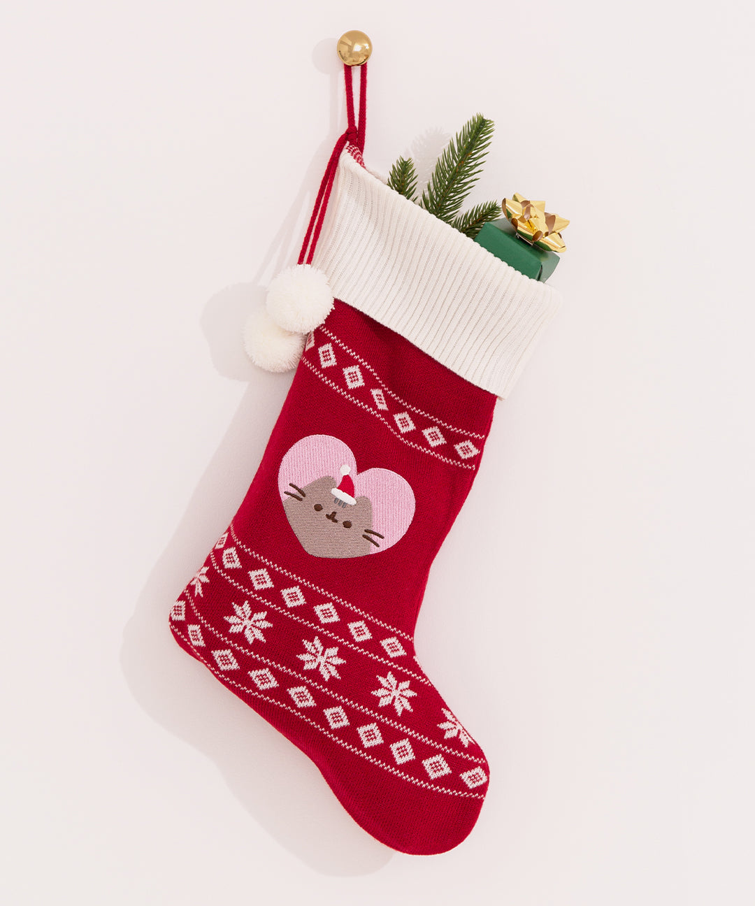 • Knit Stocking features snowflake and diamond knit details, festive Pusheen applique, white pom poms, and a knit loop for hanging.