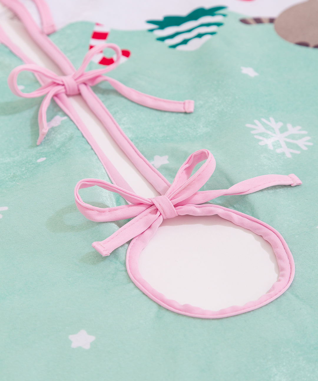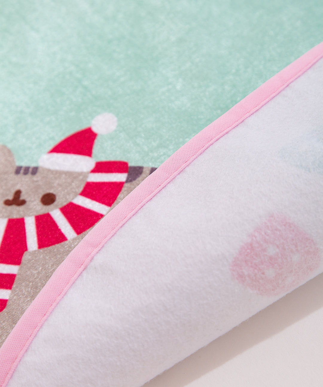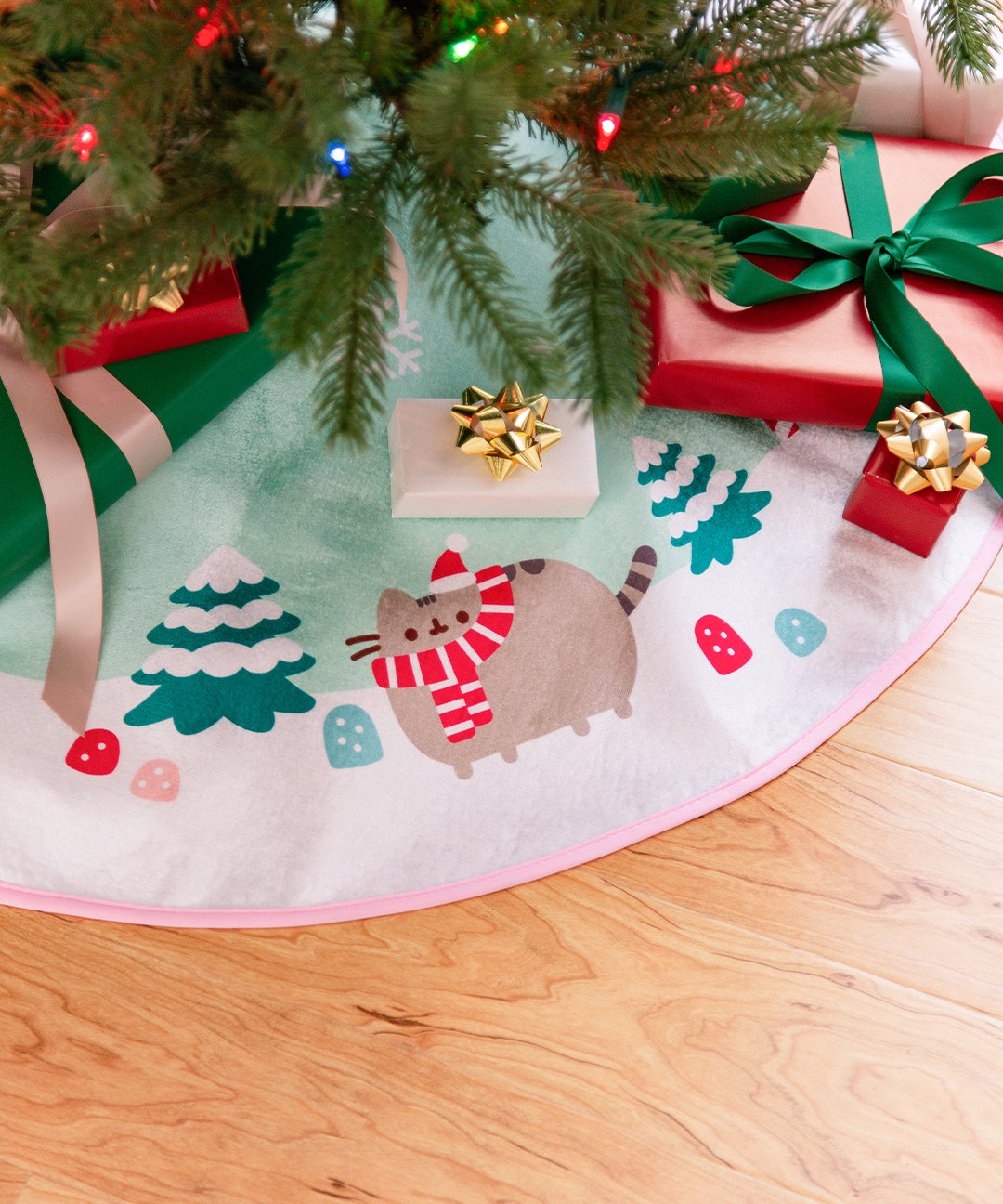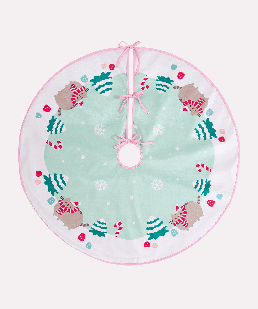 Celebrate the holiday season with Pusheen! This fun & festive Pusheen Shop Exclusive Holiday Tree Skirt features a repeating pattern of Pusheen in a snowy landscape surrounded by snow-covered pine trees, gum drops, and candy canes. Tree skirt comes complete with a hole at the center and three pink tie closures for easy decorating and to water tree.