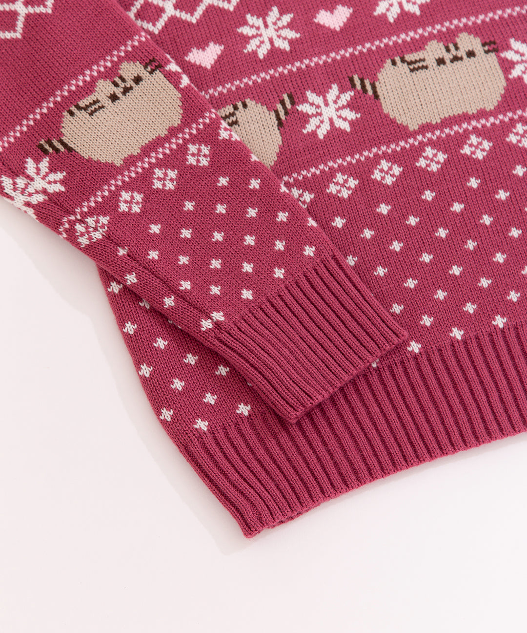 - Knit Sweater features Pusheen surrounded by snowflake and heart patterns that wrap around the front and back of sweater.